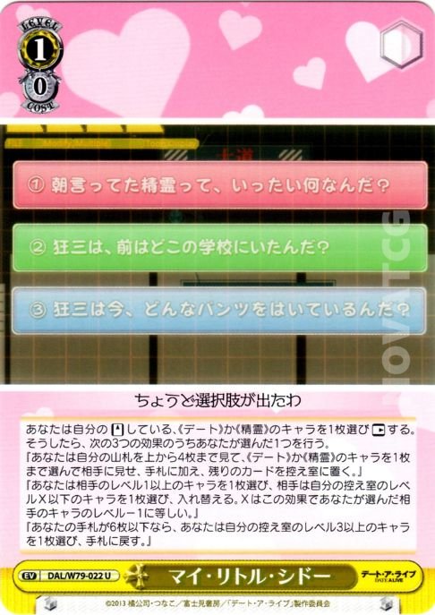 あなたは自分の【スタンド】している、《デート》か《精霊》のキャラを1枚選び【レスト】する。そうしたら、次の3つの効果のうちあなたが選んだ1つを行う。
