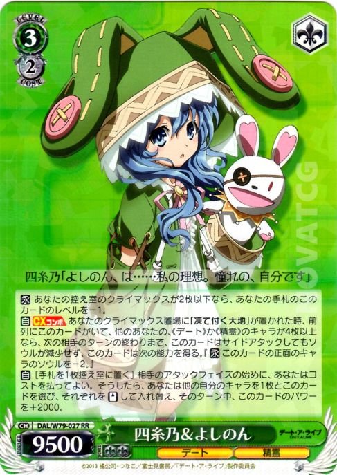 【自】【CXコンボ】 あなたのクライマックス置場に「凍て付く大地」が置かれた時、前列にこのカードがいて、他のあなたの、《デート》か《精霊》のキャラが4枚以上なら、次の相手のターンの終わりまで、このカードはサイドアタックしてもソウルが減少せず、このカードは次の能力を得る。『【永】 このカードの正面のキャラのソウルを-2。』