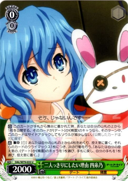 【自】 このカードが手札から舞台に置かれた時、あなたは自分の山札の上から1枚を公開する。そのカードが《デート》か《精霊》のキャラなら、そのターン中、このカードはサイドアタックしてもソウルが減少しない。(公開したカードは元に戻す)