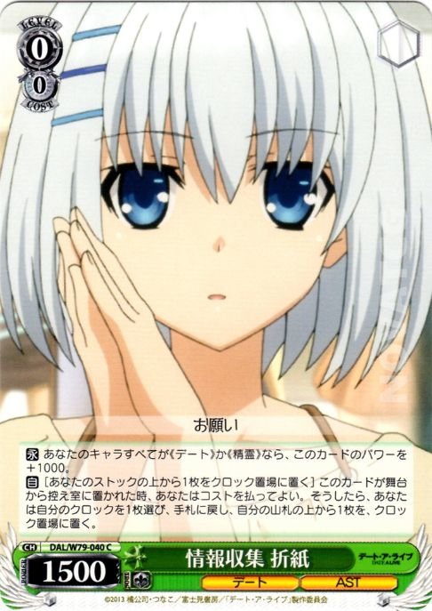 【永】 あなたのキャラすべてが《デート》か《精霊》なら、このカードのパワーを+1000。
