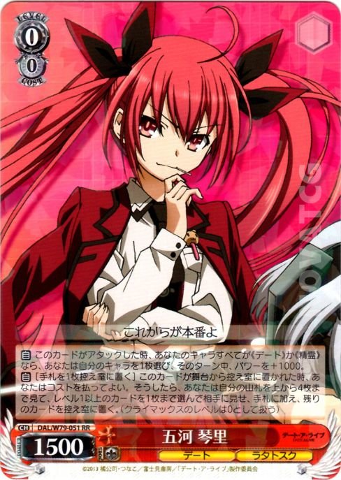 【自】 このカードがアタックした時、あなたのキャラすべてが《デート》か《精霊》なら、あなたは自分のキャラを1枚選び、そのターン中、パワーを+1000。