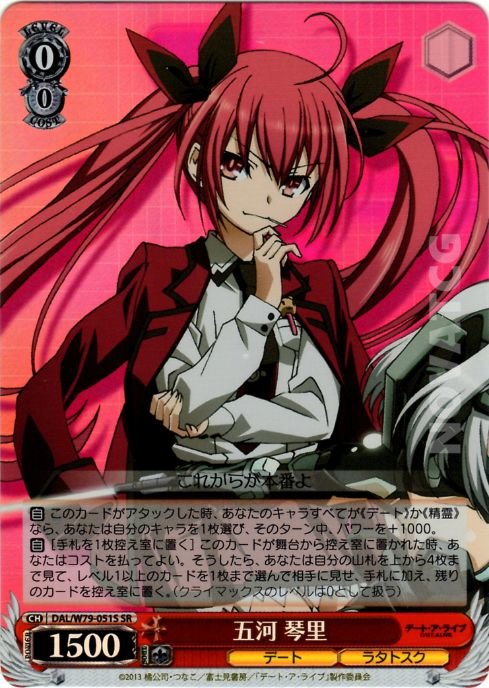 【自】 このカードがアタックした時、あなたのキャラすべてが《デート》か《精霊》なら、あなたは自分のキャラを1枚選び、そのターン中、パワーを+1000。