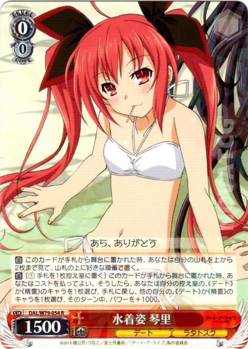 【自】[(1) 手札を1枚控え室に置く] このカードが手札から舞台に置かれた時、あなたはコストを払ってよい。そうしたら、あなたは自分の控え室の、《デート》か《精霊》のキャラを1枚選び、手札に戻し、他の自分の、《デート》か《精霊》のキャラを1枚選び、そのターン中、パワーを+1000。