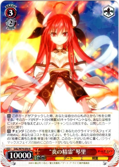 【自】 このカードがアタックした時、あなたは自分の山札の上から1枚を公開する。そのカードが《デート》か《精霊》のキャラかイベントなら、あなたは相手に1ダメージを与えてよい。(ダメージキャンセルは発生する。公開したカードは元に戻す)