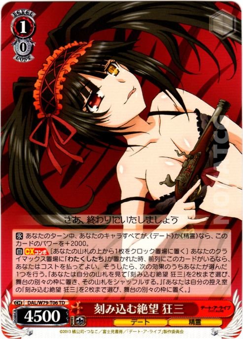 【自】【CXコンボ】[あなたの山札の上から1枚をクロック置場に置く] あなたのクライマックス置場に「わたくしたち」が置かれた時、前列にこのカードがいるなら、あなたはコストを払ってよい。そうしたら、次の効果のうちあなたが選んだ1つを行う。『あなたは自分の山札を見て「刻み込む絶望 狂三」を2枚まで選び、舞台の別々の枠に置き、その山札をシャッフルする。』『あなたは自分の控え室の「刻み込む絶望 狂三」を2枚まで選び、舞台の別々の枠に置く。』