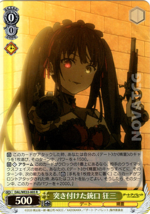 【自】【クロック】 アラーム このカードがクロックの1番上にあるなら、相手のクライマックスフェイズの始めに、あなたの、《デート》か《精霊》のキャラすべてに、そのターン中、次の能力を与える。『【自】[手札を1枚控え室に置く] このカードがフロントアタックされた時、あなたはコストを払ってよい。そうしたら、そのターン中、このカードのパワーを+2000。』