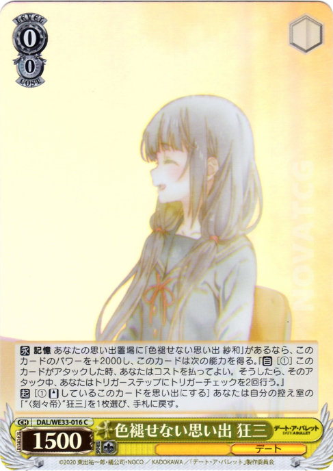 【永】 記憶 あなたの思い出置場に「色褪せない思い出 紗和」があるなら、このカードのパワーを+2000し、このカードは次の能力を得る。『【自】[(1)] このカードがアタックした時、あなたはコストを払ってよい。そうしたら、そのアタック中、あなたはトリガーステップにトリガーチェックを2回行う。』