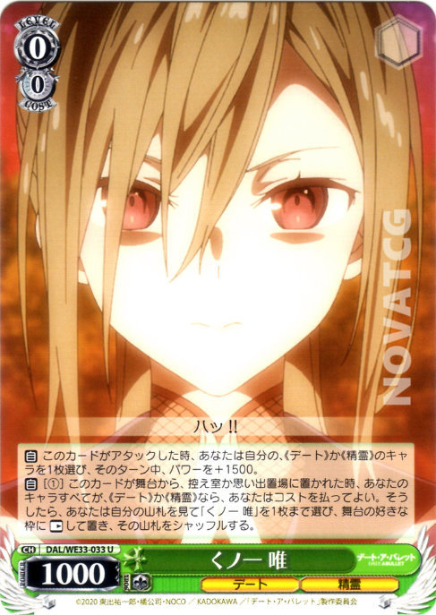 【自】[(1)] このカードが舞台から、控え室か思い出置場に置かれた時、あなたのキャラすべてが、《デート》か《精霊》なら、あなたはコストを払ってよい。そうしたら、あなたは自分の山札を見て「くノ一 唯」を1枚まで選び、舞台の好きな枠に【レスト】して置き、その山札をシャッフルする。