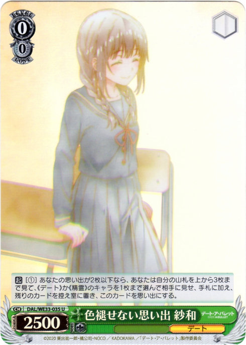 【起】[(1)] あなたの思い出が2枚以下なら、あなたは自分の山札を上から3枚まで見て、《デート》か《精霊》のキャラを1枚まで選んで相手に見せ、手札に加え、残りのカードを控え室に置き、このカードを思い出にする。