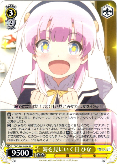 【自】[(2) 手札の「過ぎ去る日々 ひな」を1枚控え室に置く] このカードがアタックした時、あなたはコストを払ってよい。そうしたら、あなたは自分のキャラを1枚選び、そのターン中、次の能力を与える。『【自】 この能力は1ターンにつき1回まで発動する。このカードの与えたダメージがキャンセルされた時、あなたは相手に同じダメージを与えてよい。』(ダメージキャンセルは発生する)