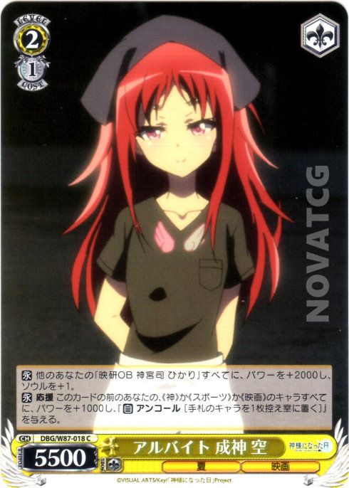 【永】 応援 このカードの前のあなたの、《神》か《スポーツ》か《映画》のキャラすべてに、パワーを+1000し、『【自】 アンコール [手札のキャラを1枚控え室に置く]』を与える。