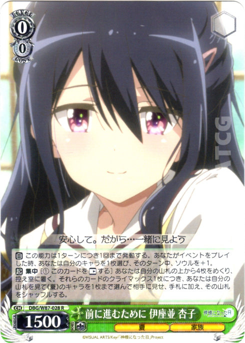 [S] – BRAINSTORM [(1) REST this card] Reveal the top four cards of your Deck, place them into Waiting Room, for each Climax revealed, search your deck for up to one《Summer》Character and show it to opponent, add it to Hand, shuffle your Deck afterwards.