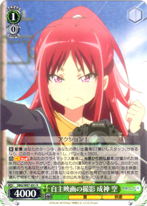 【自】【CXコンボ】 あなたのクライマックス置場に「神懸かり的な脚本」が置かれた時、前列にこのカードがいて、他のあなたの《夏》のキャラがいるなら、次の2つの効果のうちあなたが選んだ1つを行う。『あなたは自分の控え室の「自主映画」を1枚選び、手札に戻す。』『あなたは自分の山札を見て「自主映画」を1枚まで選んで相手に見せ、手札に加え、その山札をシャッフルする。』