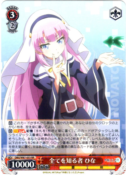 [A] – CX COMBO RECOLLECTION [Place 1 card from Hand into Waiting Room] When this card attacks, if you have [神の力] in your Climax Area, you may pay cost. If you do, look at up to 2 cards from the top of your opponent’s Deck, choose up to 2 Characters whose total Levels is equal to or lower than X, and put them into your opponent’s Clock in any order, then send the rest to Waiting Room. X is equal to the number of different named Events in your Memory.
