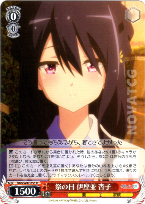 [A] – When this Card is placed on Stage from Hand, if you have two or more other《Summer》Characters, you may draw 1 card. If you did, choose one card in your Hand, send it to Waiting Room.