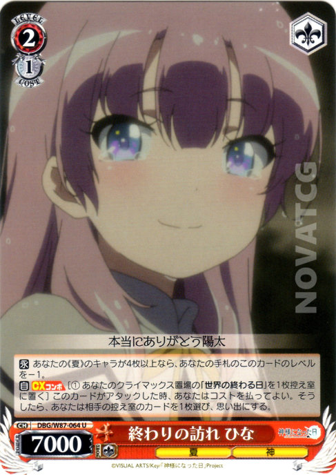 【自】【CXコンボ】[(1) あなたのクライマックス置場の「世界の終わる日」を1枚控え室に置く] このカードがアタックした時、あなたはコストを払ってよい。そうしたら、あなたは相手の控え室のカードを1枚選び、思い出にする。