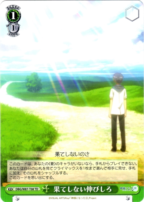 このカードは、あなたの《夏》のキャラがいないなら、手札からプレイできない。あなたは自分の山札を見てクライマックスを1枚まで選んで相手に見せ、手札に加え、その山札をシャッフルする。