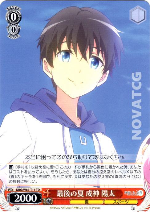 【自】[手札を1枚控え室に置く] このカードが手札から舞台に置かれた時、あなたはコストを払ってよい。そうしたら、あなたは自分の控え室のレベルX以下の《夏》のキャラを1枚選び、手札に戻す。Xはあなたの控え室の「降臨の日 ひな」の枚数に等しい。