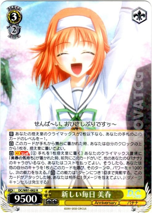 【自】【CXコンボ】[(2) 手札を1枚控え室に置く] あなたのクライマックス置場に「美春の気持ち」が置かれた時、前列にこのカードがいて、他のあなたの《バナナ》のキャラがいるなら、あなたはコストを払ってよい。そうしたら、あなたは他の自分のキャラを1枚とこのカードを選び、そのターン中、パワーを+1000し、次の能力を与える。『【自】 この能力は1ターンにつき1回まで発動する。このカードがアタックした時、あなたは相手に1ダメージを与えてよい。』(ダメージキャンセルは発生する)