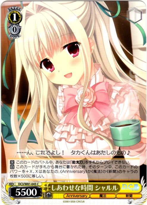 【自】 このカードが手札から舞台に置かれた時、そのターン中、このカードのパワーを+X。Xはあなたの、《Anniversary》か《魔法》か《新聞》のキャラの枚数×500に等しい。