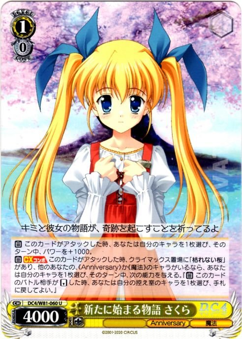 【自】【CXコンボ】 このカードがアタックした時、クライマックス置場に「枯れない桜」があり、他のあなたの、《Anniversary》か《魔法》のキャラがいるなら、あなたは自分のキャラを1枚選び、そのターン中、次の能力を与える。『【自】 このカードのバトル相手が【リバース】した時、あなたは自分の控え室のキャラを1枚選び、手札に戻してよい。』