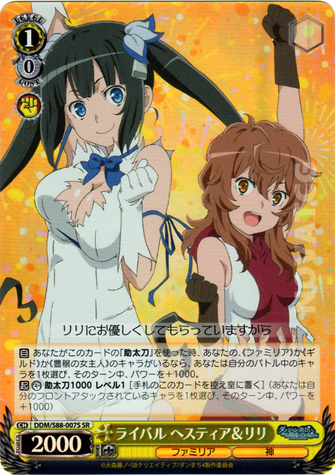 【自】 あなたがこのカードの『助太刀』を使った時、あなたの、《ファミリア》か《ギルド》か《豊穣の女主人》のキャラがいるなら、あなたは自分のバトル中のキャラを1枚選び、そのターン中、パワーを+1000。