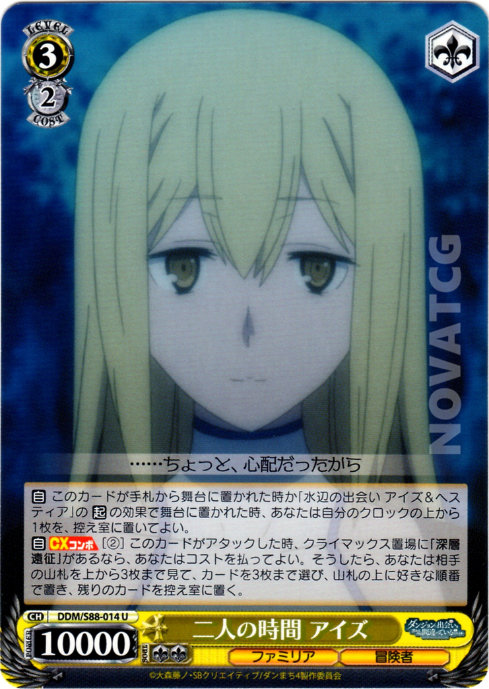 [A] – When this card is placed on Stage from Hand or by the [S] effect of [水辺の出会い アイズ&ヘスティア], you may send the top card of your Clock to Waiting Room.