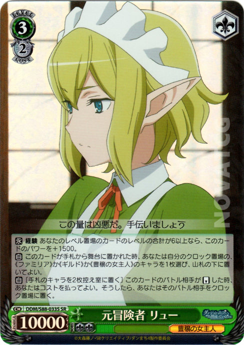 【自】 このカードが手札から舞台に置かれた時、あなたは自分のクロック置場の、《ファミリア》か《ギルド》か《豊穣の女主人》のキャラを1枚選び、山札の下に置いてよい。