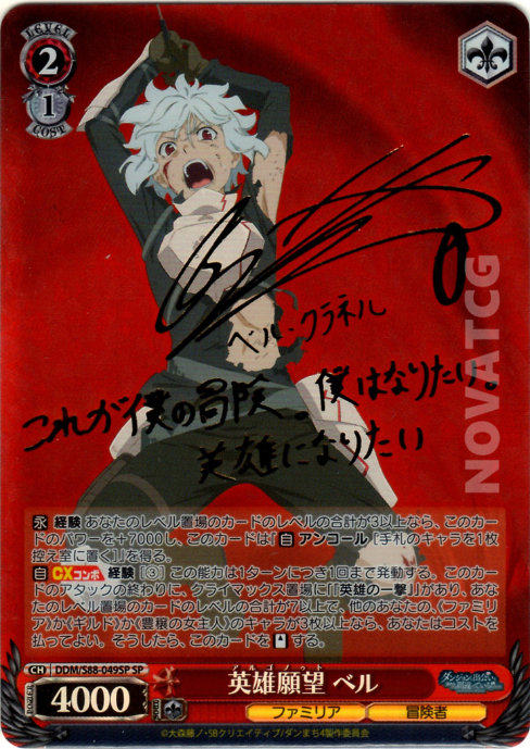 [A] – CX COMBO EXPERIENCE [(3)] This effect activates up to once per turn. At the end of this card’s attack, if you have [『英雄の一撃』] in your Climax Zone, if the total Level of cards in your Level Zone is seven or higher, if you have three or more «Familia», «Guild», or «Hostess of Fertility» Characters, you may pay the cost. If you did, STAND this card.