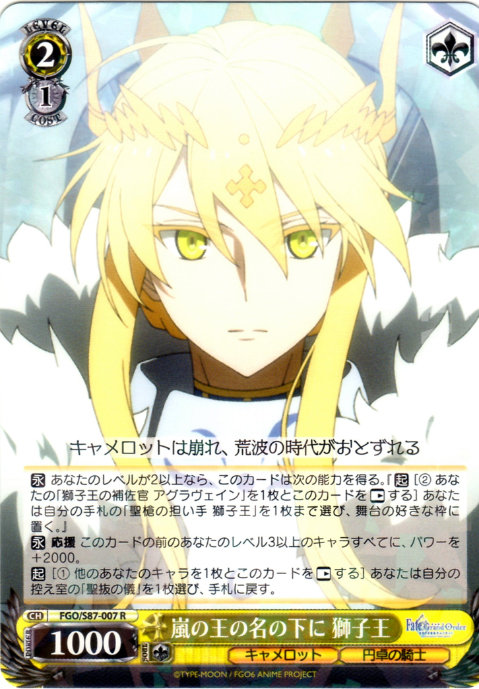 -[S] – [(2) REST this card and [獅子王の補佐官 アグラヴェイン]] Choose up to one [聖槍の担い手 獅子王] in your Hand, place it on any slot on Stage.