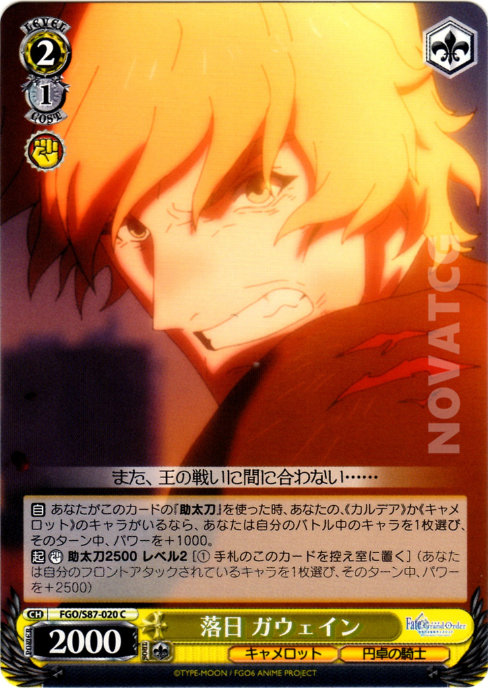 【自】 あなたがこのカードの『助太刀』を使った時、あなたの、《カルデア》か《キャメロット》のキャラがいるなら、あなたは自分のバトル中のキャラを1枚選び、そのターン中、パワーを+1000。