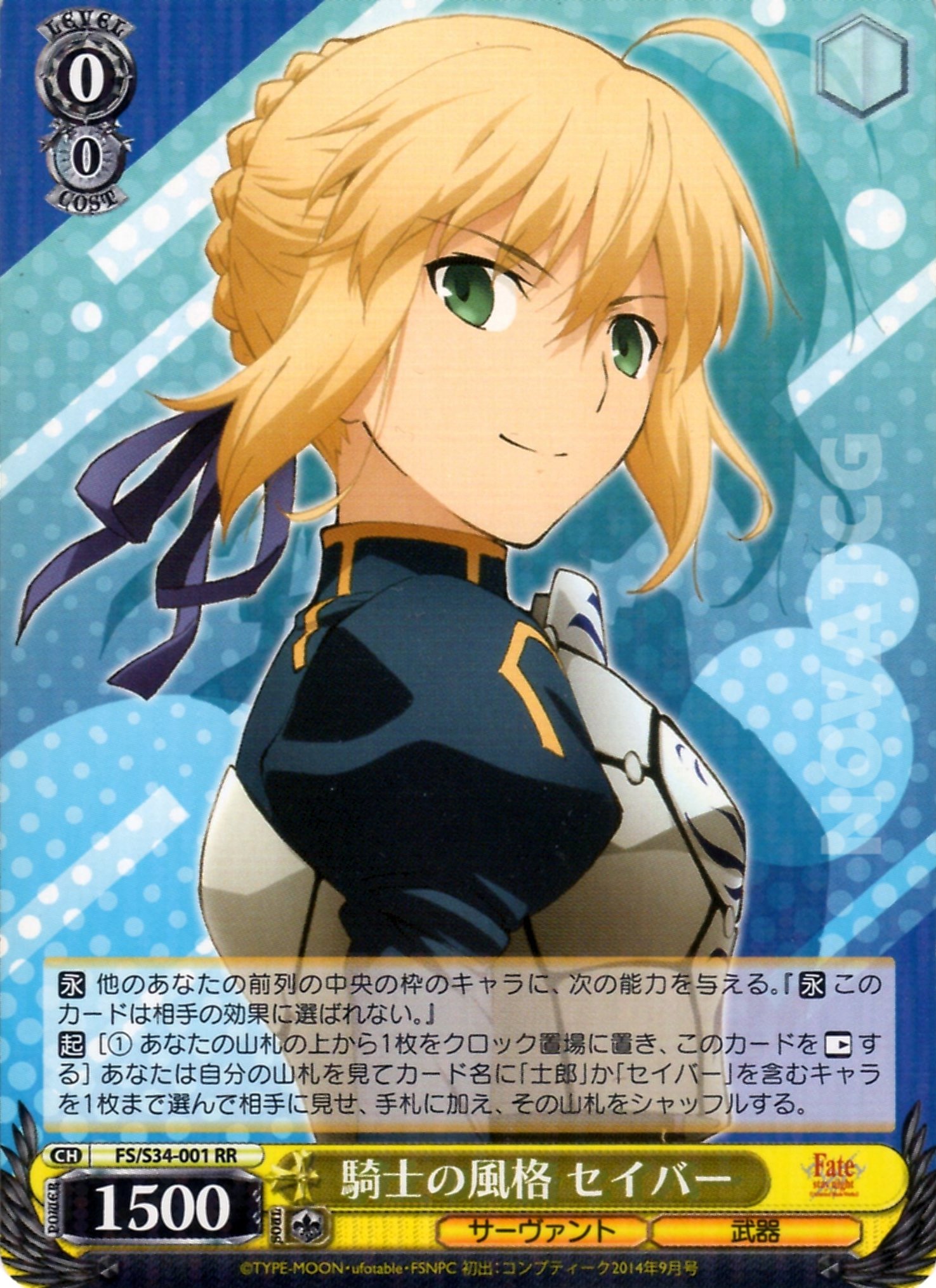 【起】[(1) あなたの山札の上から1枚をクロック置場に置き、このカードを【レスト】する] あなたは自分の山札を見てカード名に「士郎」か「セイバー」を含むキャラを1枚まで選んで相手に見せ、手札に加え、その山札をシャッフルする。