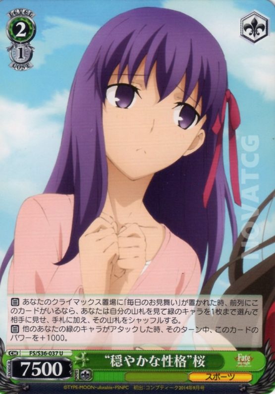 【自】 あなたのクライマックス置場に「毎日のお見舞い」が置かれた時、前列にこのカードがいるなら、あなたは自分の山札を見て緑のキャラを1枚まで選んで相手に見せ、手札に加え、その山札をシャッフルする。