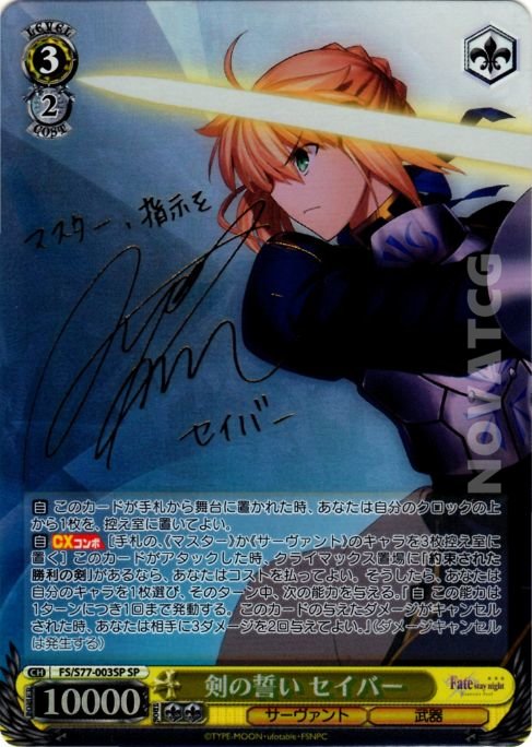 【自】【CXコンボ】[手札の、《マスター》か《サーヴァント》のキャラを3枚控え室に置く] このカードがアタックした時、クライマックス置場に「約束された勝利の剣」があるなら、あなたはコストを払ってよい。そうしたら、あなたは自分のキャラを1枚選び、そのターン中、次の能力を与える。『【自】 この能力は1ターンにつき1回まで発動する。このカードの与えたダメージがキャンセルされた時、あなたは相手に3ダメージを2回与えてよい。』(ダメージキャンセルは発生する)