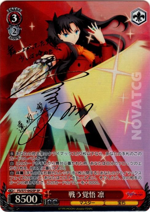 【自】 共鳴 [手札の「宝石剣ゼルレッチ」を1枚公開する] あなたのクライマックスフェイズの始めに、あなたはコストを払ってよい。そうしたら、次の相手のターンの終わりまで、このカードのパワーを+3000。