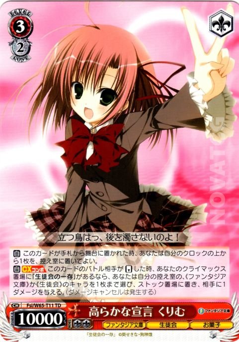 【自】【CXコンボ】 このカードのバトル相手が【リバース】した時、あなたのクライマックス置場に「生徒会の一存」があるなら、あなたは自分の控え室の、《ファンタジア文庫》か《生徒会》のキャラを1枚まで選び、ストック置場に置き、相手に1ダメージを与える。(ダメージキャンセルは発生する)