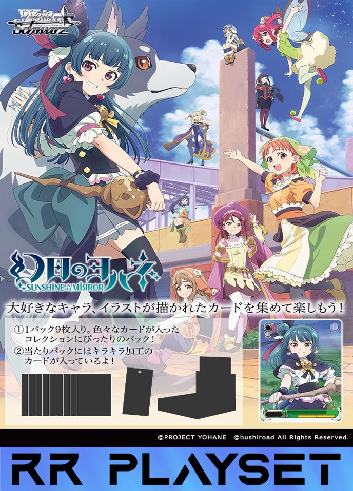 This will come with 4 copies of all of the following rarities: C/U/R/CC/CR/RR/TD from the “Genjitsu no Yohane” Weiss Schwarz booster set.
