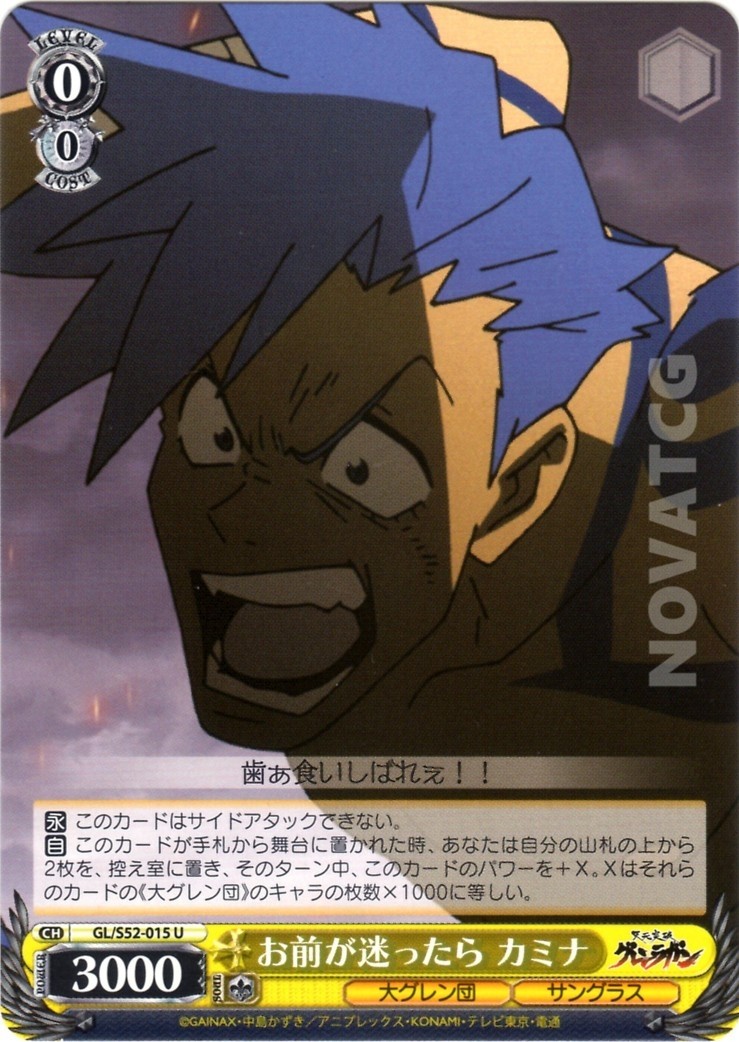 【自】 このカードが手札から舞台に置かれた時、あなたは自分の山札の上から2枚を、控え室に置き、そのターン中、このカードのパワーを+X。Xはそれらのカードの《大グレン団》のキャラの枚数×1000に等しい。