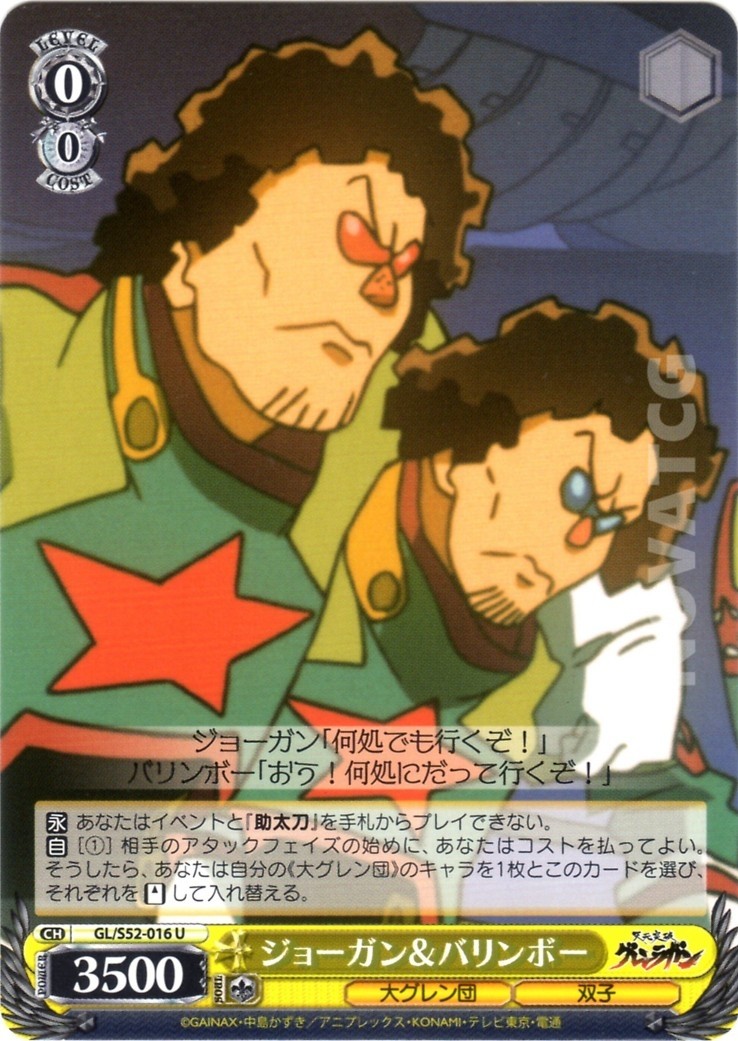【自】[(1)] 相手のアタックフェイズの始めに、あなたはコストを払ってよい。そうしたら、あなたは自分の《大グレン団》のキャラを1枚とこのカードを選び、それぞれを【スタンド】して入れ替える。