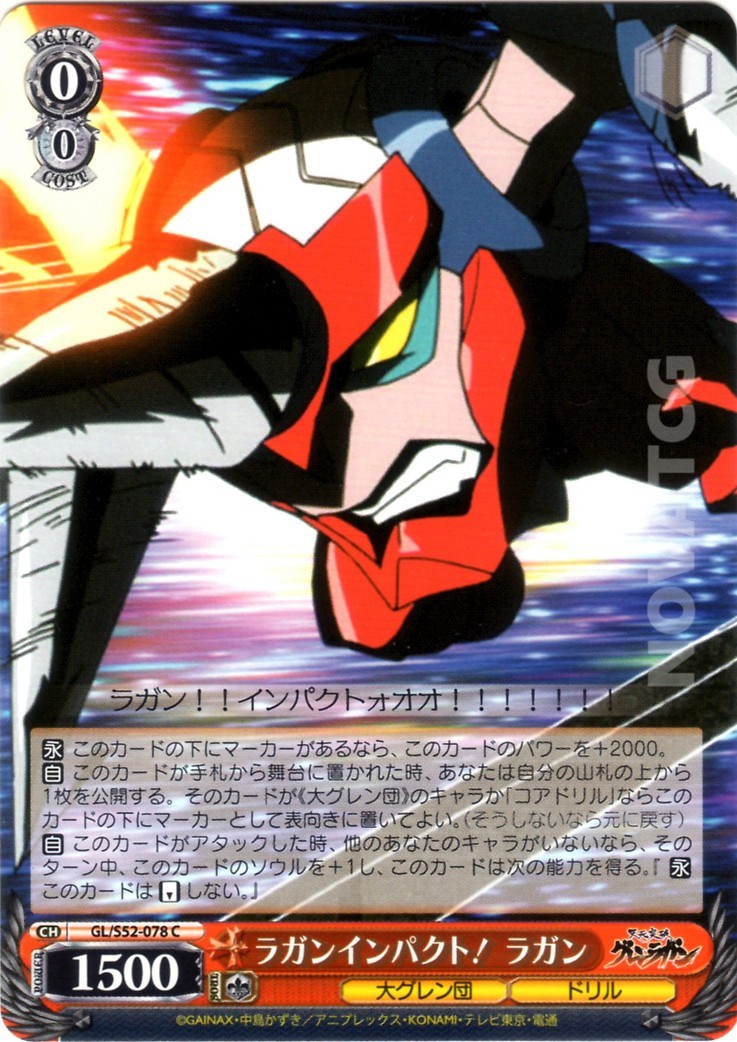 【自】 このカードが手札から舞台に置かれた時、あなたは自分の山札の上から1枚を公開する。そのカードが《大グレン団》のキャラか「コアドリル」ならこのカードの下にマーカーとして表向きに置いてよい。(そうしないなら元に戻す)