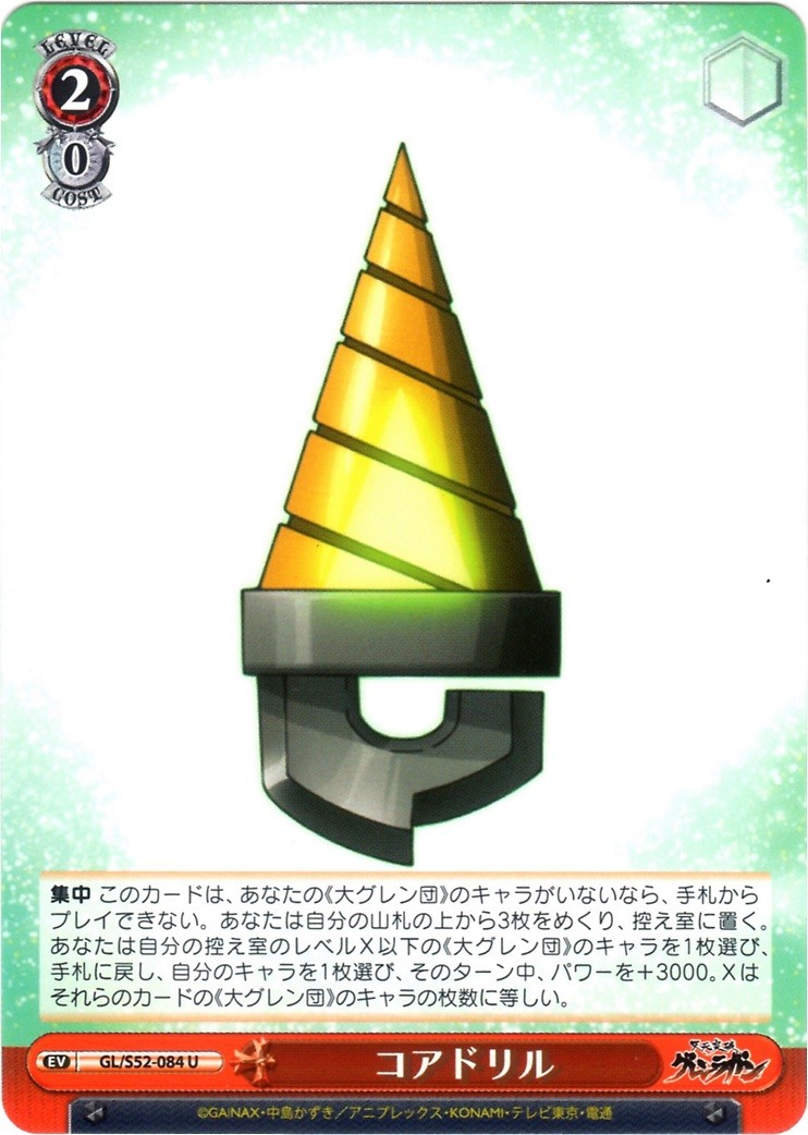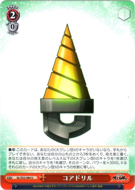 集中 このカードは、あなたの《大グレン団》のキャラがいないなら、手札からプレイできない。あなたは自分の山札の上から3枚をめくり、控え室に置く。あなたは自分の控え室のレベルX以下の《大グレン団》のキャラを1枚選び、手札に戻し、自分のキャラを1枚選び、そのターン中、パワーを+3000。Xはそれらのカードの《大グレン団》のキャラの枚数に等しい。