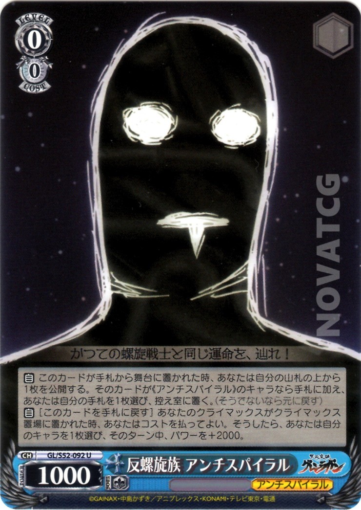 【自】 このカードが手札から舞台に置かれた時、あなたは自分の山札の上から1枚を公開する。そのカードが《アンチスパイラル》のキャラなら手札に加え、あなたは自分の手札を1枚選び、控え室に置く。(そうでないなら元に戻す)