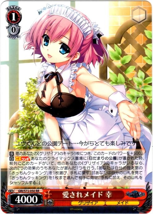 【自】【CXコンボ】 あなたのクライマックス置場に「日だまりの公園」が置かれた時、前列にこのカードがいて、他のあなたの《グリザイア》のキャラがいるなら、次の2つの効果のうちあなたが選んだ1つを行う。『あなたは自分の控え室の「さっちんクッキング」を1枚選び、手札に戻す。』『あなたは自分の山札を見て「さっちんクッキング」を1枚まで選んで相手に見せ、手札に加え、その山札をシャッフルする。』