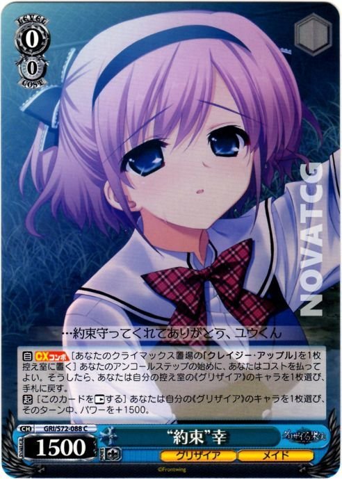 【自】【CXコンボ】[あなたのクライマックス置場の「クレイジー・アップル」を1枚控え室に置く] あなたのアンコールステップの始めに、あなたはコストを払ってよい。そうしたら、あなたは自分の控え室の《グリザイア》のキャラを1枚選び、手札に戻す。