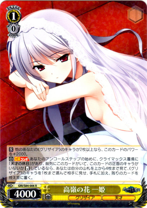 【自】【CXコンボ】 あなたのアンコールステップの始めに、クライマックス置場に「天才の休日」があり、前列にこのカードがいて、このカードの正面のキャラがいないか【リバース】しているなら、あなたは自分の山札を上から4枚まで見て、《グリザイア》のキャラを1枚まで選んで相手に見せ、手札に加え、残りのカードを控え室に置く。
