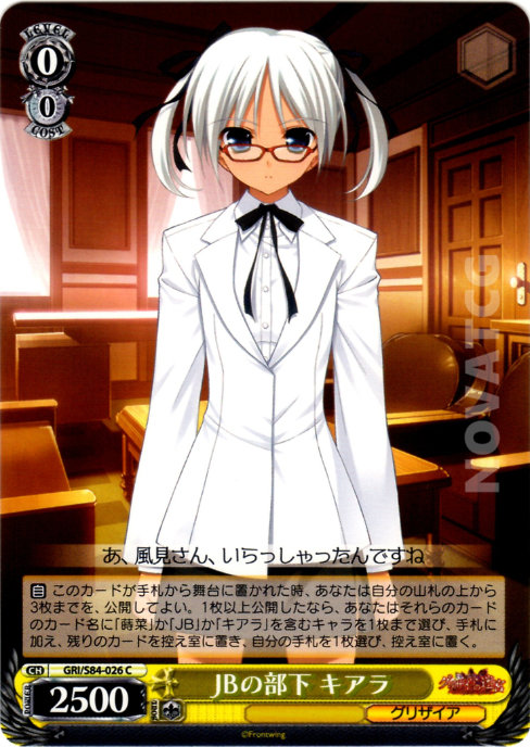 【自】 このカードが手札から舞台に置かれた時、あなたは自分の山札の上から3枚までを、公開してよい。1枚以上公開したなら、あなたはそれらのカードのカード名に「蒔菜」か「JB」か「キアラ」を含むキャラを1枚まで選び、手札に加え、残りのカードを控え室に置き、自分の手札を1枚選び、控え室に置く。