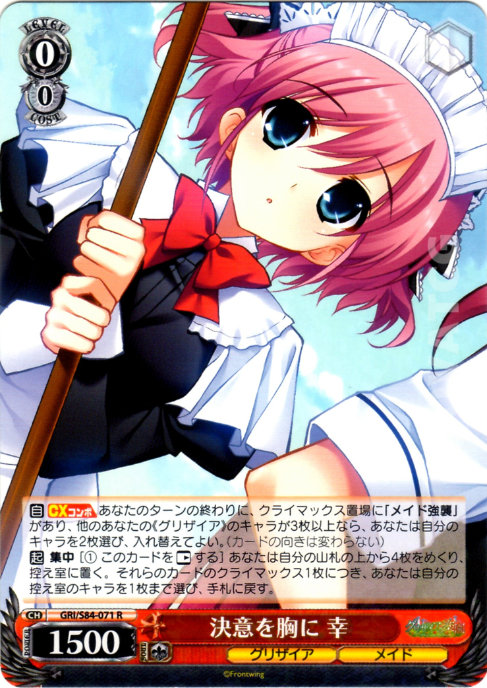 [A] – CX COMBO At the end of your turn, if you have [メイド強襲] in your Climax Zone, if you have three or more other《Grisaia》Characters, choose two of your Characters, swap their positions.