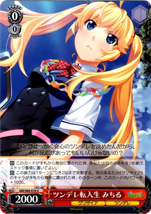 【自】 この能力は1ターンにつき2回まで発動する。他のあなたの《グリザイア》のキャラが手札から舞台に置かれた時、そのターン中、このカードのパワーを+1000。