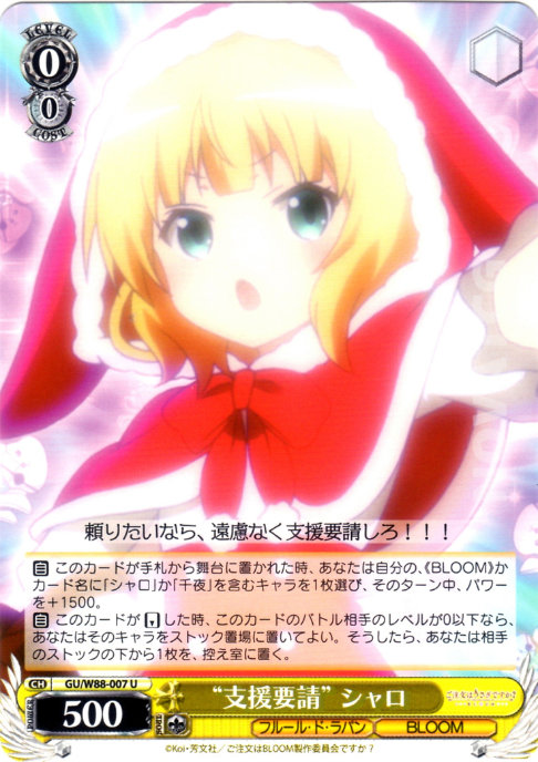 【自】 このカードが手札から舞台に置かれた時、あなたは自分の、《BLOOM》かカード名に「シャロ」か「千夜」を含むキャラを1枚選び、そのターン中、パワーを+1500。
