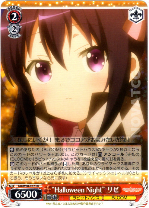 [C] – If you have two or more other《BLOOM》or《Rabbit House》Characters, this card gains +3500 Power and [[A] – ENCORE (Place one《BLOOM》or《Rabbit House》Character from Hand into Waiting Room)].